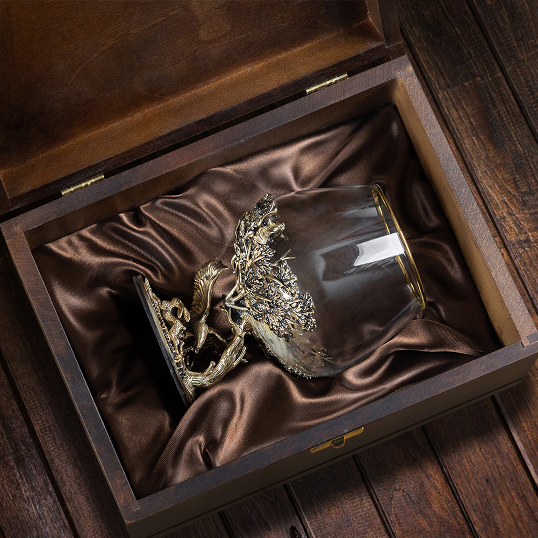 Громкий респект Человеку, на котором держится всё! Хрустальный бокал для виски в бронзовом обрамлении имеет множество символичных изображений - его хоче