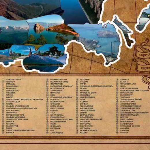Вам нравится путешествовать и покорять новые неизведанные вами места? Тогда эта карта для вас: она станет наглядных дневником путешествий, только записи в ней надо делать не ручкой, а монеткой. Карта России покрыта специальным стираемым слоем, как на лотерейных билетах. Чтобы отметить место, которое вы посетили - достаточно стереть защитный слой монеткой.