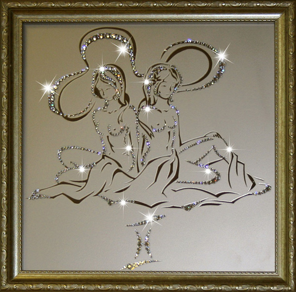 Каждый знак Зодиака соответствует далекому недостижимому созвездию на небе... и мерцающему узору из хрустальных кристаллов всемирно известной марки на Земле! Картина выполнена методом выборочной холодной абразивной обработки зеркала (пескоструй) с дальнейшей инкрустацией кристаллами. Прилагающийся сертификат удостоверяет подлинность страз Swarovski.