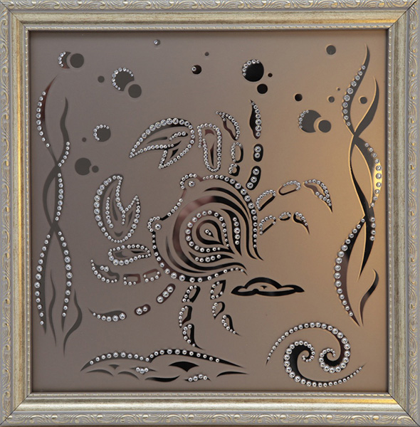 Каждый знак Зодиака соответствует далекому недостижимому созвездию на небе... и мерцающему узору из хрустальных кристаллов всемирно известной марки на Земле! Картина выполнена методом выборочной холодной абразивной обработки зеркала (пескоструй) с дальнейшей инкрустацией кристаллами. Прилагающийся сертификат удостоверяет подлинность страз Swarovski.