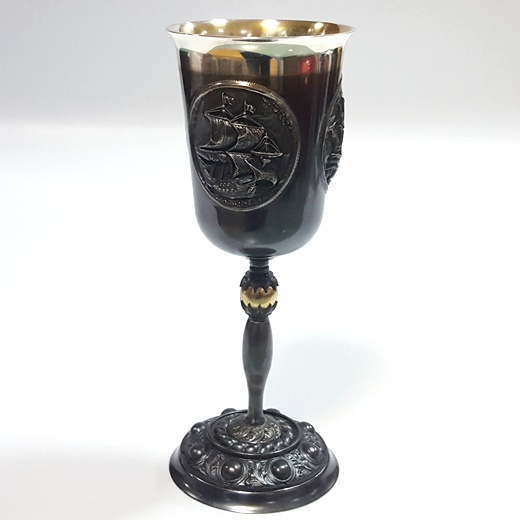 Кубок изготовлен по уникальной технологии, включающей в себя несколько этапов обработки: травление, чернение металла. Выполненный из мельхиора, покрытый тончайшим напылением кубок имеет на черненой чаше накладки в виде парусников.
