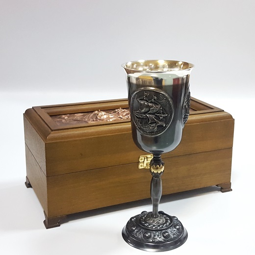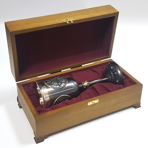 Размеры: высота кубка 22см, ширина чаши 9см, вместимость 300мл, шкатулка 30*15,5*13,5см; материалы - мельхиор, медь, дуб.