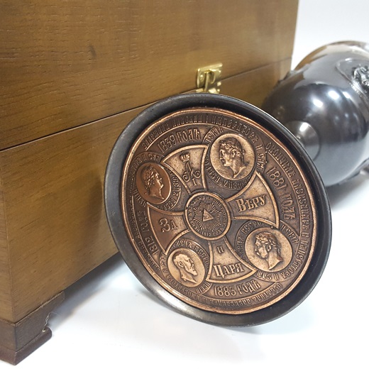 Изысканный, выполненный в морском стиле кубок изготовлен российскими мастерами,и уложен в шкатулку, крышка которой украшена медным барельефом в виде борющегося с волнами парусника. На оборотной стороне основания кубка - барельефы императоров. Ручная работа.