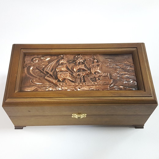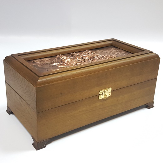 Крышка шкатулки выполнена из меди (объёмный рельеф), а затем применены техники латунирования. Корпус шкатулки изготовлен из натурального дерева - дуб.