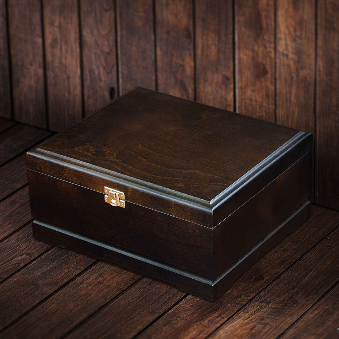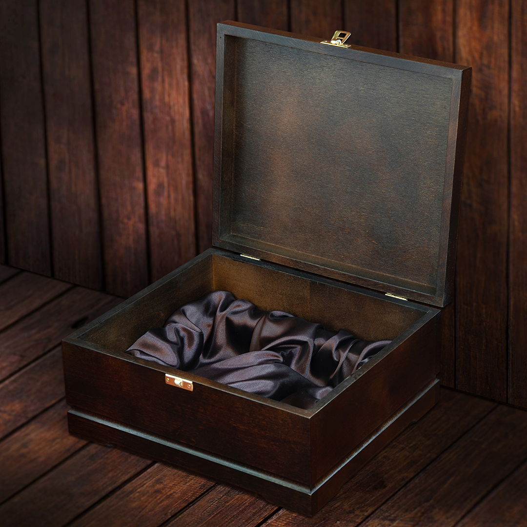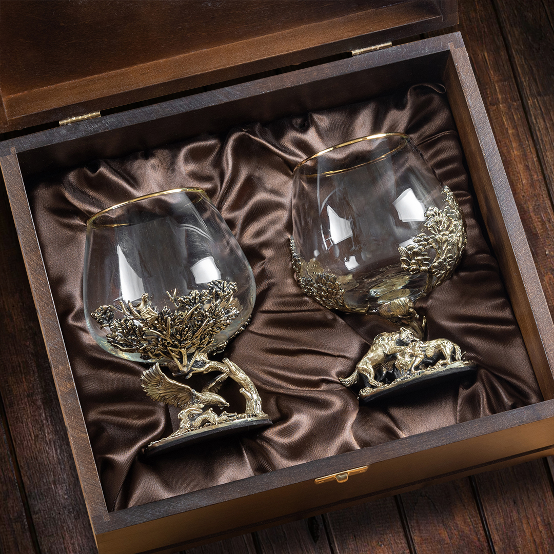 В наборе 2 бокала для коньяка в деревянной шкатулке из массива с шёлковым ложементом