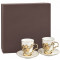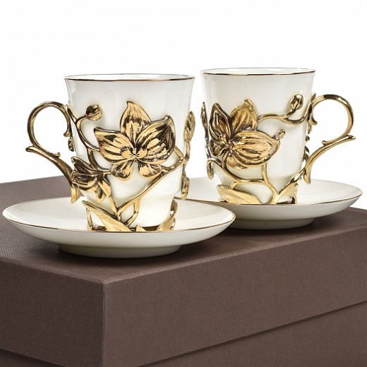 Солнечные лучики прекрасного утра, красота окружающего мира застыли на двух тончайших чашках из императорского фарфора, помещенных в изящные цветочные оправы, каждый элемент которых отлит вручную из латуни.