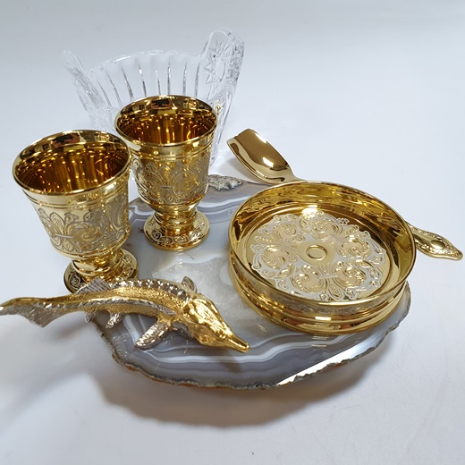 Драгоценный набор на срезе агата состоит из хрустальной икорницы с позолоченной ложечкой, двух позолоченных рюмок и скульптуры осетринки на каменном основании! Такая золотая легенда достойна стать экспонатом в коллекции эксклюзивной посуды. Золото 999,9, никель, срез агата, хрусталь.