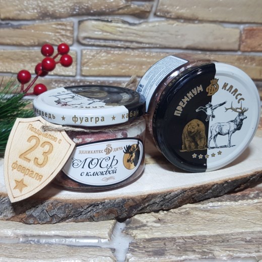 - Мясо лося с клюквой, 220г - деликатес в стеклянной баночке. Это настоящее изящное звучание вкуса. Состав: мясо лося, мясной бульон, клюква, масло сливочное, эмульгатор Е415, соль поваренная пищевая, пряности молотые (перец черный, чеснок, экстрак пряностей(чеснок), загуститель Е412, перец черный, мацис, мускатный орех, антиокислитель Е316.