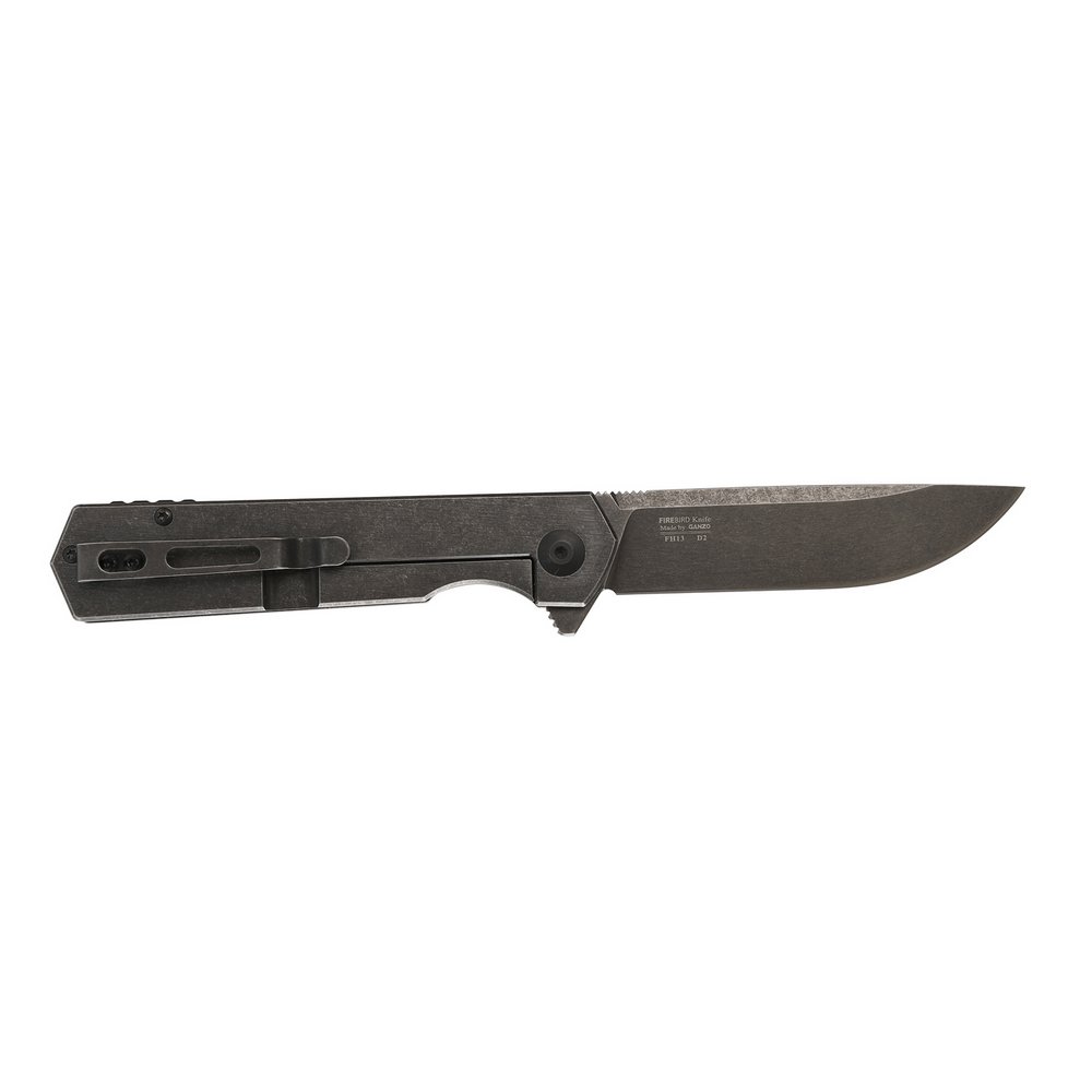 Firebird FH13-SS - нож, который сразу же привлекает внимание своим дизайном. Не менее примечателен он и техническими характеристиками. Данная модель целиком изготовлена из металла. Для клинка применяется сталь марки D2. Это сплав из разряда полунержавеющих, однако высокую коррозийную устойчивость ему дает присутствие в составе никеля и хрома. К тому же, лезвие покрыто защитной краской, которая и придает ему темный цвет. Сталь отшлифована методом Stone washed, благодаря чему она полностью матовая и не отражает солнечных лучей. Дополнительным преимуществом такой шлифовки является то, что на поверхности лезвия остаются незаметными небольшие царапины и потертости. Длина клинка составляет 87 мм, а толщина его обуха равна 3,3 мм. Таким ножом будет одинаково удобно выполнять мелкие ремонтные работы или же готовить пищу в походных условиях. Тем более, что форма лезвия также универсальная - Drop Point. Он заканчивается острым кончиком и имеет ровную линию обуха. Заточен нож Firebird FH13-SS гладко.