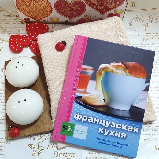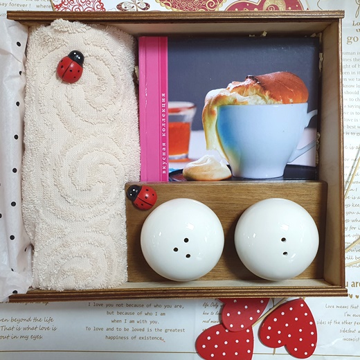 В деревянной шкатулке подарок для молодой хозяйки: сборник французских рецептов, изысканный набор для специй и пушистое полотенце для нежных ручек.