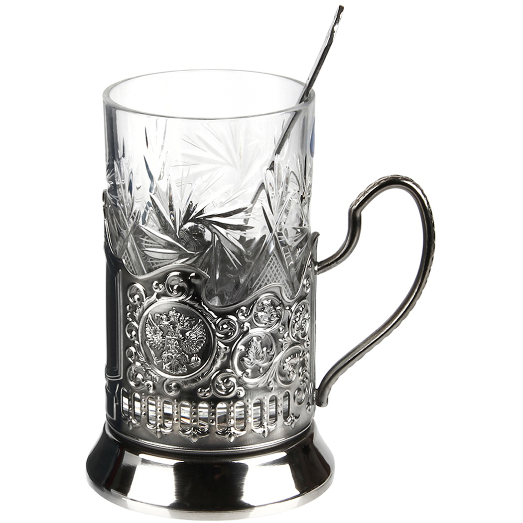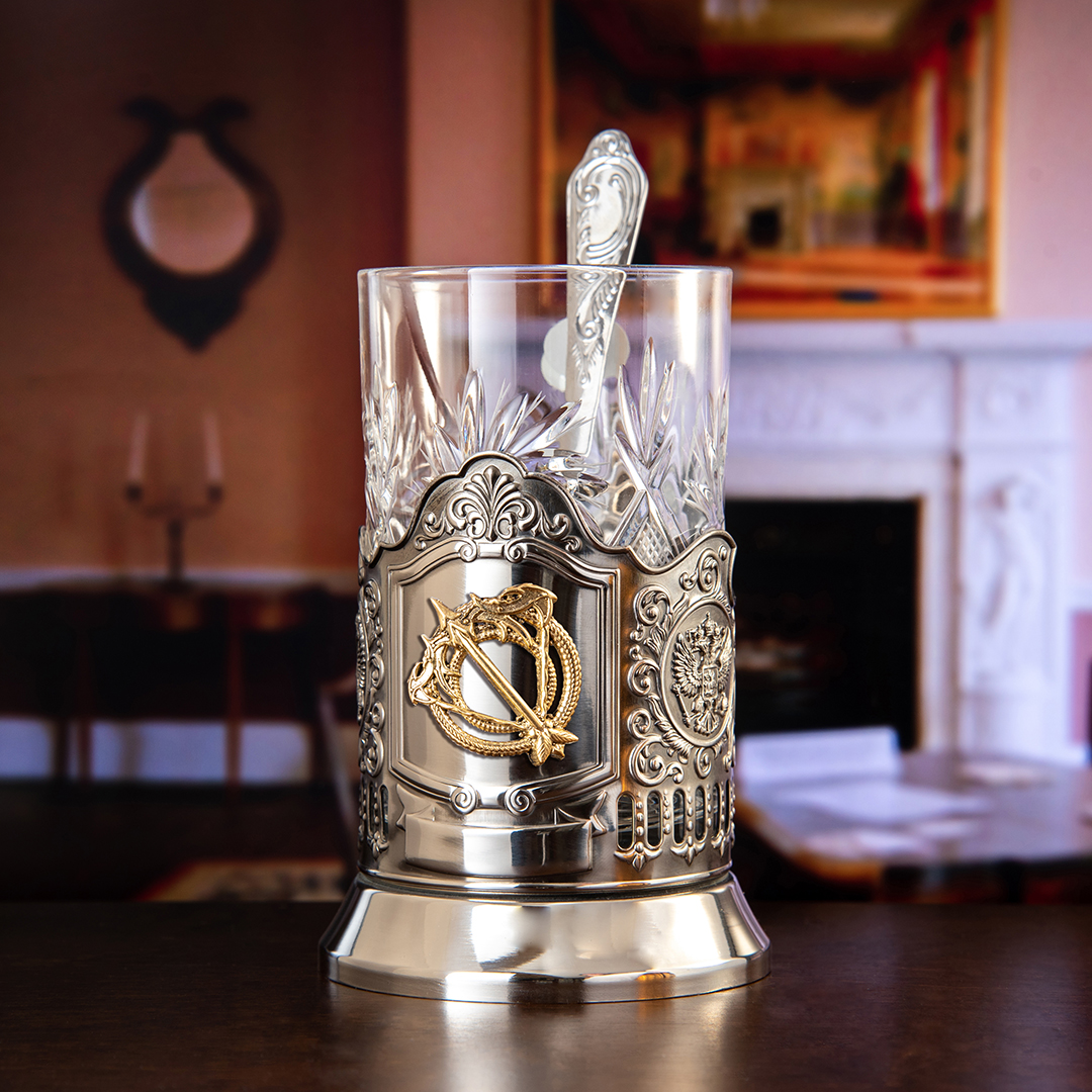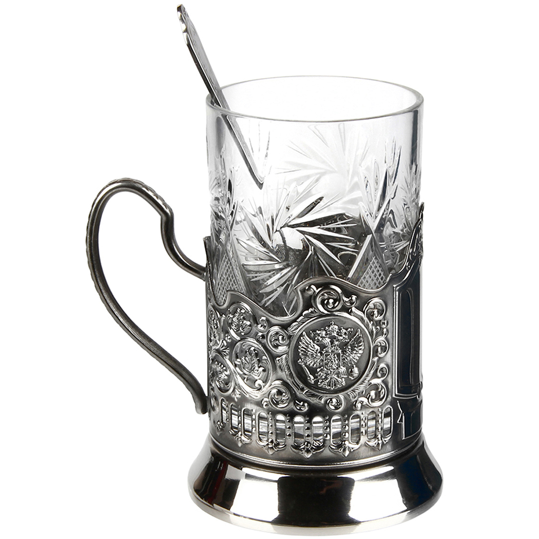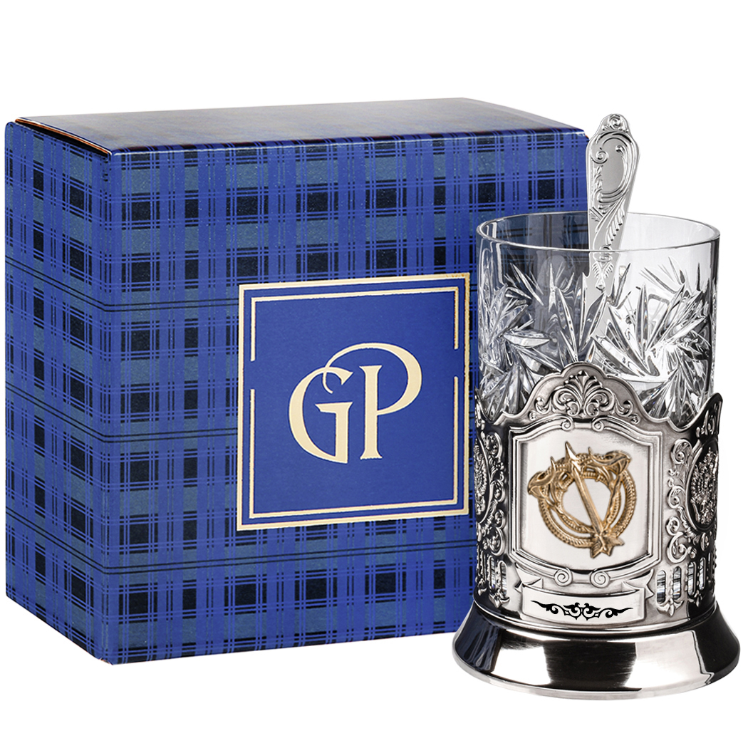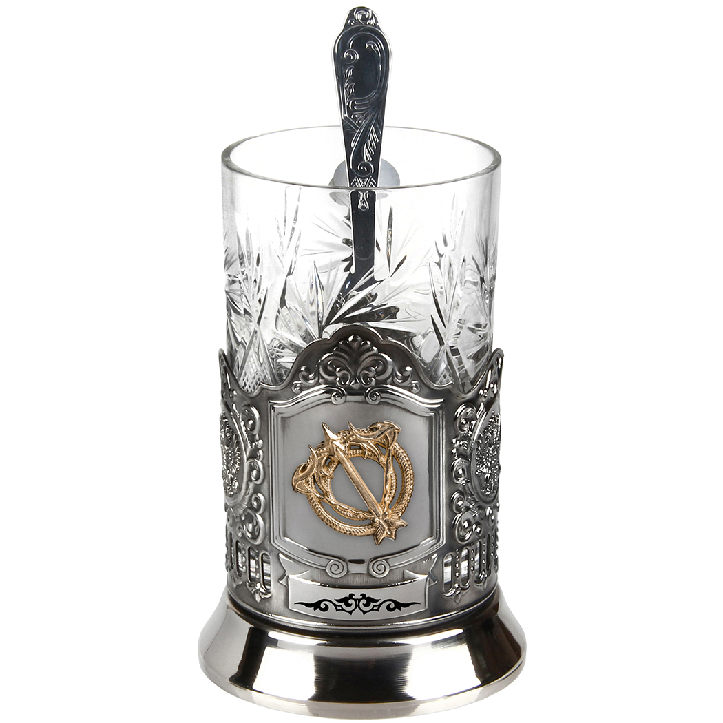 Подстаканник никель с хрустальным стаканом и накладкой "Стрелец" латунь, с ложкой, в картонной коробке