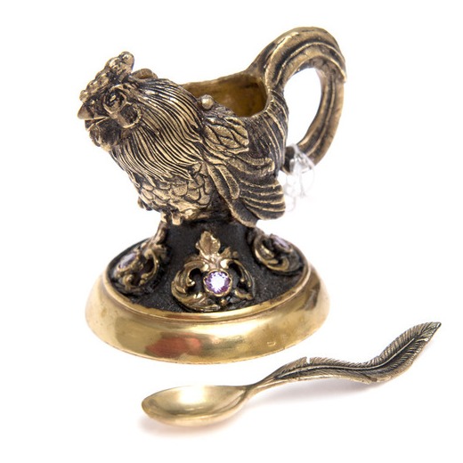 Изящное и функциональное интерьерное украшение подчеркнёт вкус любого застолья. Восхитительная солонка в форме петуха с ложечкой-пером станет символом духовного обновления и оберегом от злых сил. Художественное литьё, позолота, медь, аметист, ручная работа.
