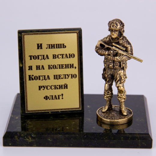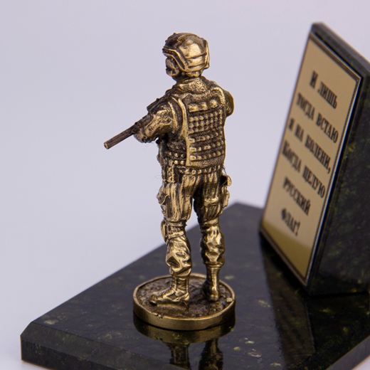 Стильная патриотичная бронзовая статуэтка спецназовца - своего рода ода тем, чьей профессией стала защита Родины. На шильд нанесены проникновенные слова. Основание - натуральный камень змеевик.