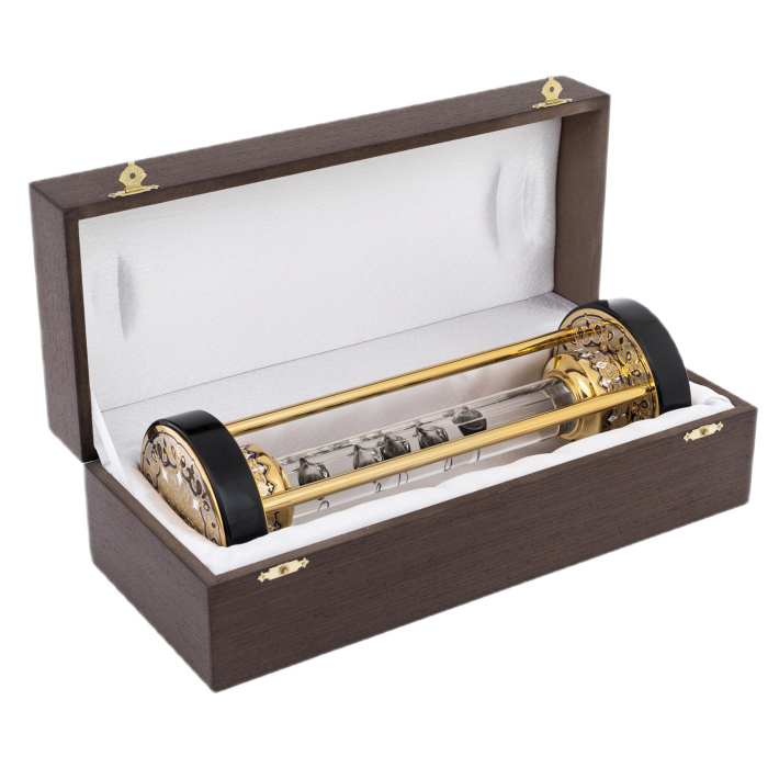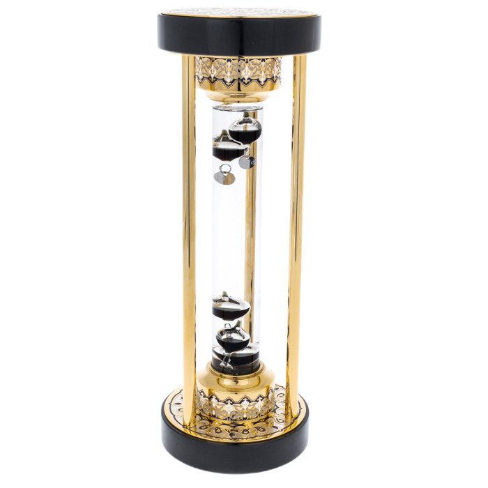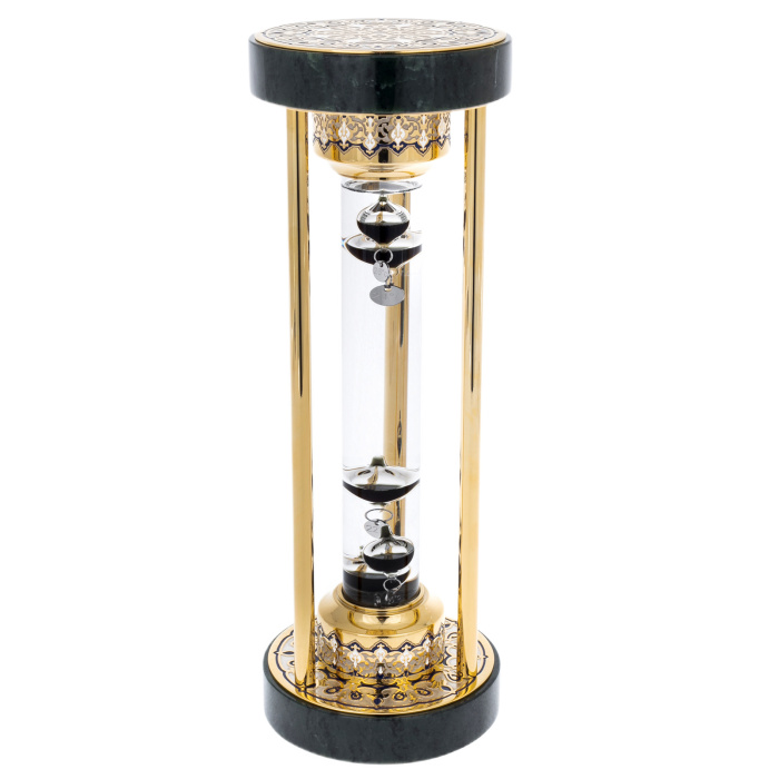 Необычный термометр, изобретенный итальянским физиком Галилеем еще в XVI столетии, облачен в драгоценный корпус, внутри которого, словно нефтяные капли, "подвисли" поплавки с показаниями температуры. Прибор всегда точно покажет текущие значения температуры воздуха, не имея шкалы или циферблата... Сплав цветных мелаллов, золото, ювелирные эмали, гальванопластика, основание - нефрит.