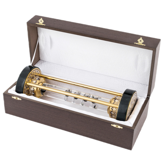 Дизайн термометра выполнен в технике Златоустовской гравюры: корпус термометра щедро покрыт золотом 999 пробы. Основания термометра выполнены из нефрита, декорированные позолоченными накладками - изысканный восточный орнамент, выполненный рисовкой иглой по металлу и заполненный холодными ювелирными эмалями. Техника исполнения: токарные и слесарные работы, изысканная рисовка кистью по металлу, многоступенчатая гравировка иглой по лаку, ручная подрезка, полировка, покрытие золотом, гальванопластика.