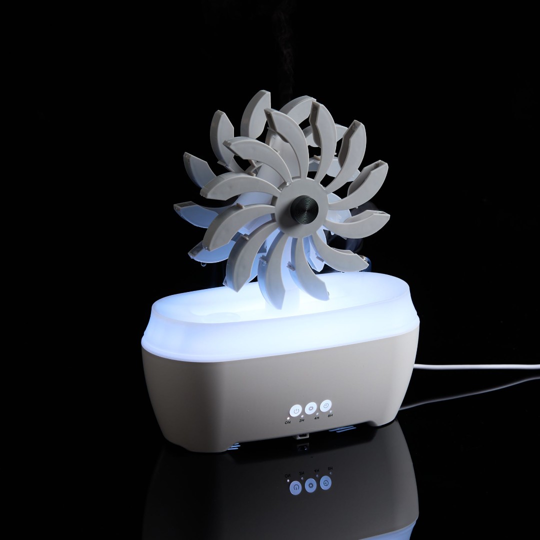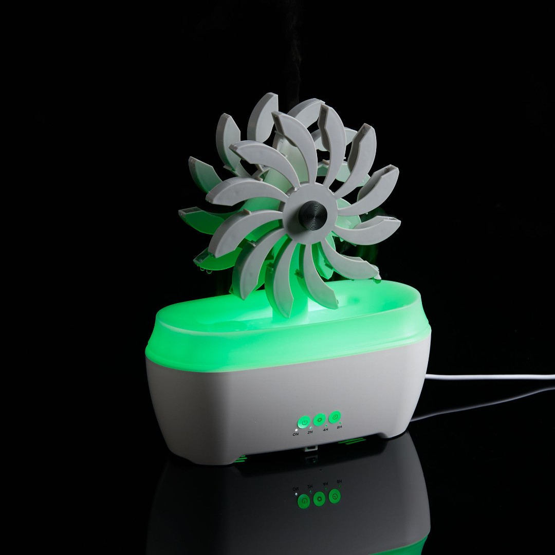 Необычный увлажнитель-ароматизатор имеет лопасти, которые начинают двигаться разнонаправленно, когда на них попадает вода. Разноцветная подсветка. Завораживающее и умиротворяющее зрелище! Этот гаджет не только создаст в доме здоровый микроклимат, но и станет прекрасным предметом медитации. В устройство можно добавить несколько капель ароматического масла и устроить себе сеанс арома-терапии! Для помещений 25-30м2, емкость 300 мл на 7-8 часов работы.