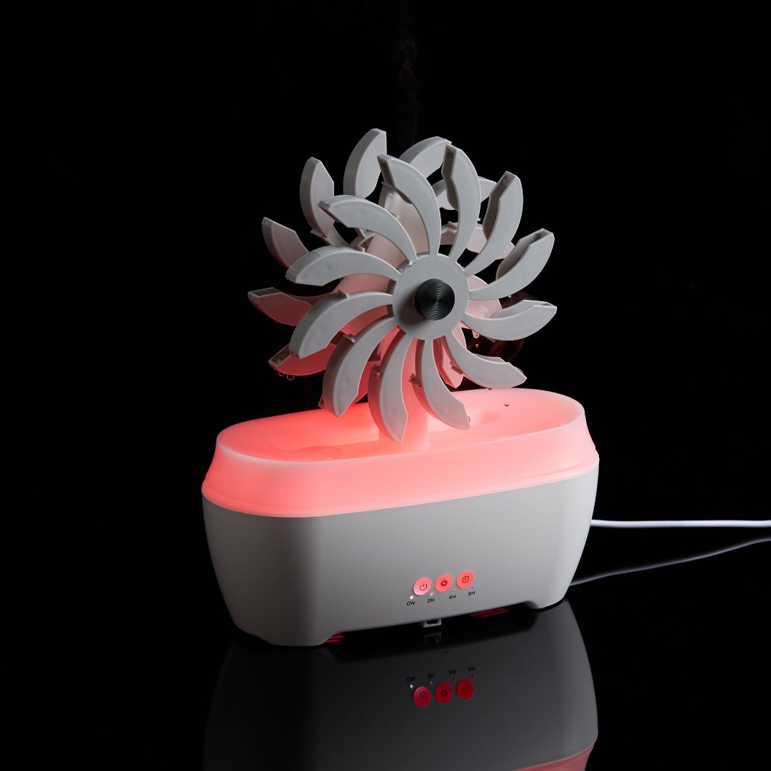 Наш гаджет, обеспечит увлажнение воздуха, а значит и комфортную атмосферу в доме в течение всего дня. А, добавив в воду несколько капель ароматического раствора или масла, можно устроить себе сеанс арома-терапии. Нереальный, сюрреалистичный эффект движения лопастей поможет расслабиться перед сном или лучше сконцентрироваться в течение рабочего дня.